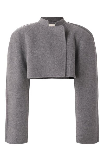 Укороченную куртку Rotha со скульптурными закругленными рукавами выполнили из меланжевой шерсти. Модель с подкладом-купро и объемными складками на спине дополнена воротником-стойкой.