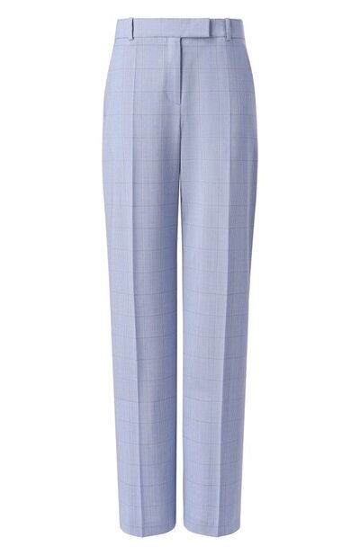 Клетчатые брюки с четырьмя врезными карманами сшиты из шерсти первого пострига. Модель прямого кроя украшена сзади небольшим металлическим логотипом марки.