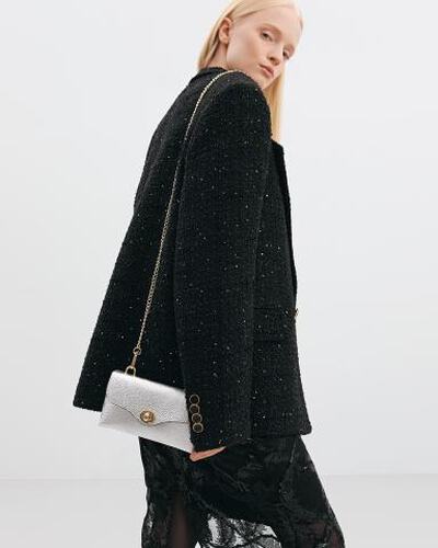 Небольшая сумочка из натуральной кожи в серебристом цвете от ANNA RACHELE. Изящная модель с металлическим замком и ремнем на плечо в виде металлической цепочки золотого цвета. Сумка закрывается на замок-клапан.