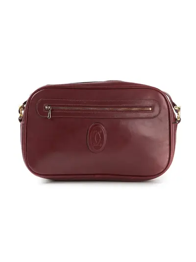 Bordeaux leather shoulder bag from Cartier Vintage featuring a front logo patch, a front zip fastening, an adjustable shoulder strap, a top zip fastening and an internal zipped pocket. Please note that vintage items are not new and therefore might have minor imperfections.