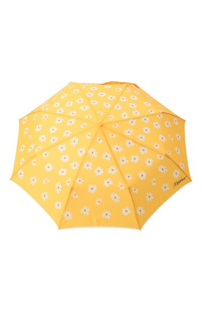 Купол зонта с металлическим каркасом изготовили из полиэстера с паттерном из ромашек. Автоматический механизм управляется кнопкой на ручке с рельефным логотипом и шнуром. В комплекте — чехол.