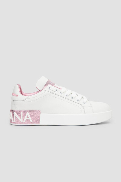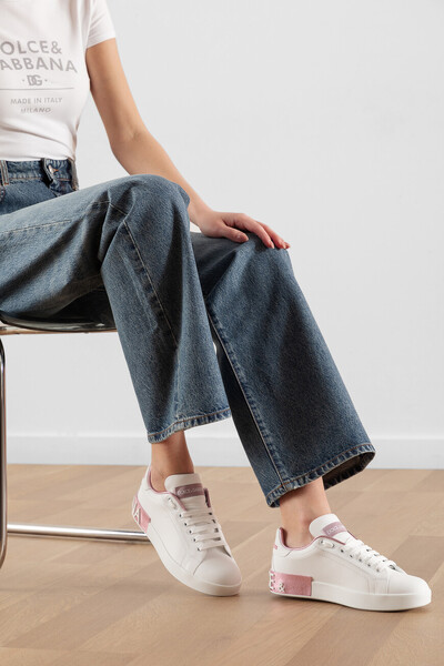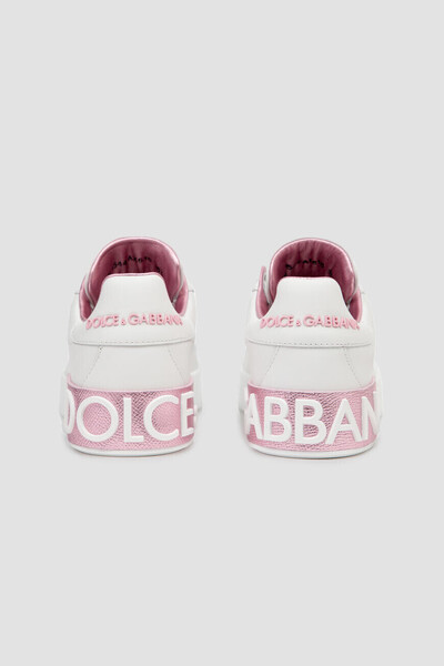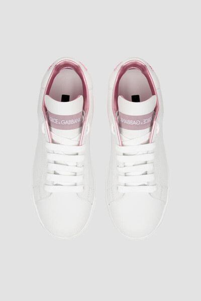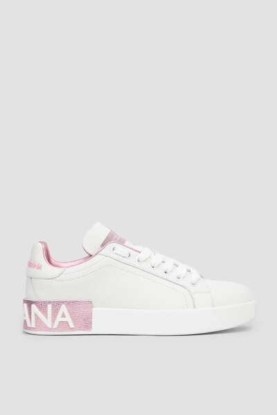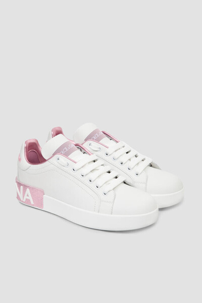 Сникеры Portofino с открытой шнуровкой от DOLCE & GABBANA. Для изготовления модели используется белая матовая кожа наппа. Декором выступают лакированная кожаная вставка розового оттенка с тиснением Dauphine и белым рельефным логотипом, нанесенным методом инжекционного микролитья, на заднике, нежно-розовый рельефный лого бренда также на заднике и брендированная нашивка на язычке.