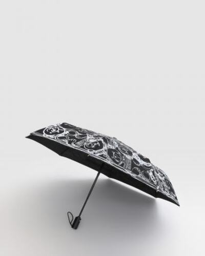 Зонт с фирменным принтом от Moschino. Этот небольшой зонтик в чёрном цвете станет отличным подарком и добавит романтичности любому образу. Ручка дополнена текстильной петлёй, благодаря которой зонт можно носить на запястье, а благодаря компактным размерам он поместится даже в небольшую сумочку. В комплекте к зонтику прилагается чехол из ткани в цвет купола.