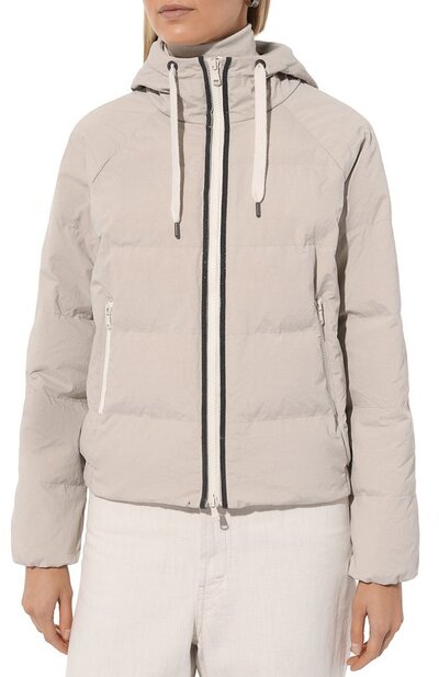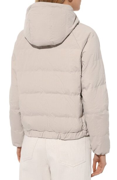 Пуховик из нейлона дополнили регулируемым капюшоном и прорезными карманами. Утепленную гусиным пухом куртку с рукавами реглан украсили отделкой из цепочки мониль вдоль встречной молнии.