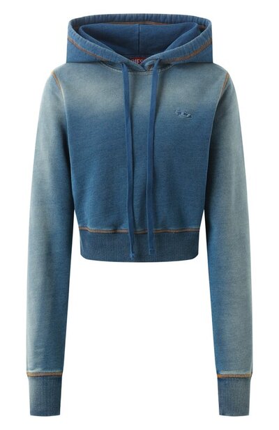 Худи из хлопкового трикотажа с махровой изнанкой кажется джинсовым благодаря характерному оттенку индиго и светлым разводам. Сходство поддерживают контрастные швы на регулируемом капюшоне, проймах, плечах, а также вдоль эластичных манжет и пояса. Укороченную модель украсили вышитой эмблемой Oval D.