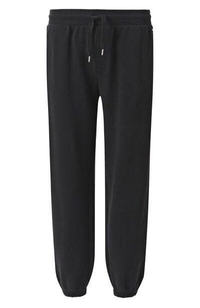 Джоггеры из хлопкового трикотажа дополнили боковыми карманами. Модель с лампасами в рубчик украсили фирменной трехцветной нашивкой и логотипом, вышитым нитью в тон на брючине.