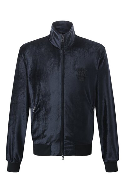 Толстовку с воротником-стойкой и рельефными трикотажными манжетами и поясом выполнили из вискозного бархата, усиленного полиэстером. Сама модель с вышитой геральдической эмблемой, как и два прорезных кармана, застегиваются на молнии.