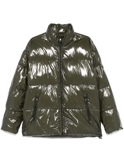 olive green front zip fastening two side zip-fastening pockets drawstring hem logo patch at the sleeve