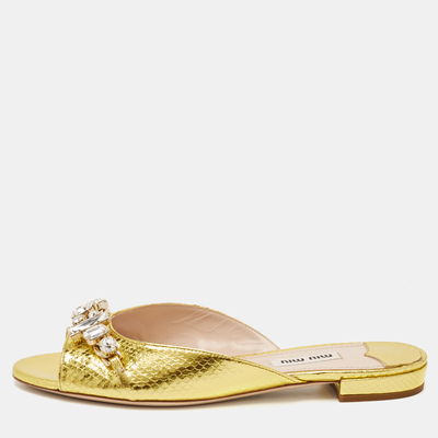 Miu Miu Gold Snakeskin Embossed Leather Bow Flat Sandals Size 36 1093753 - 1