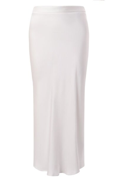 Миди-юбка из блестящего атласа будет одинаково хорошо смотреться и в повседневном образе, и в наряде для вечера. Чтобы модель комфортно сидела на талии, пояс сзади сделали эластичным.
