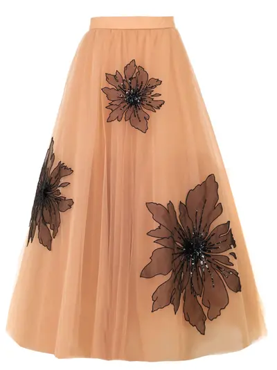 -Бежевая юбка-макси из фатиновой сетки от YANINA. -Расклешенная модель с высокой посадкой на талии, которую подчеркивает пояс, и крупным декором в виде вышитых цветов с пайетками.