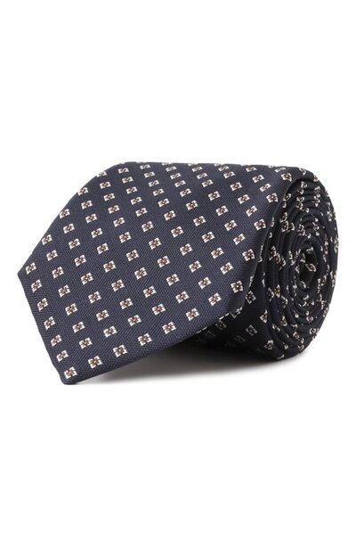 Галстук с жаккардовым геометричным узором можно вписать в образы с костюмами и блейзерами любого цвета. Для изготовления аксессуара классической ширины использовали чистый шелк.