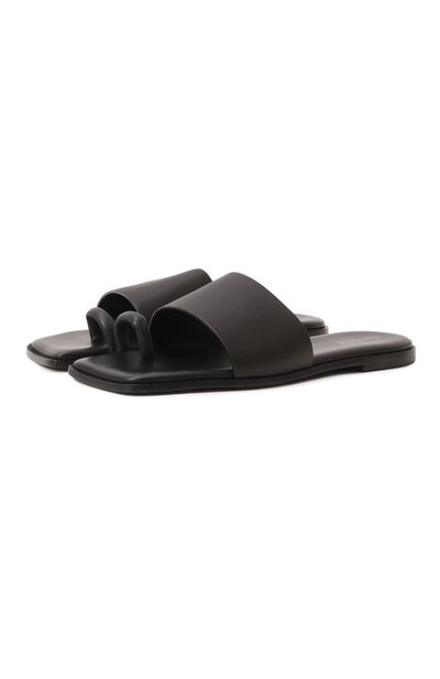Шлепанцы с широкой союзкой и отдельной перемычкой для большого пальца выполнили из мелкозернистой кожи. Модель со слегка скошенным мысом установили на тонкую подошву.