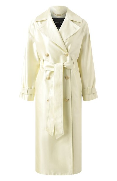 Двубортный тренч с регулируемыми патами на рукавах и высокой шлицей сзади сшили из атласа на основе шелка и хлопка. Модель с широкими лацканами, которые можно застегнуть наглухо, дополнили поясом-лентой, подчеркивающим талию.