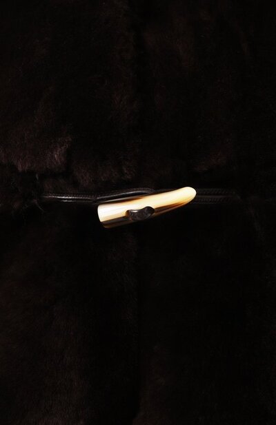 Короткую шубу с капюшоном сшили из короткостриженой густой овчины. Модель с боковыми карманами и эластичным поясом застегивается крупными клевантами с кожаными петлями.