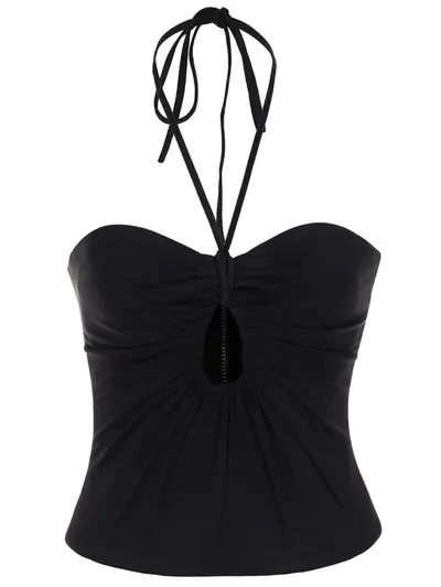 -Черный корсетный топ из мягкого вискозного трикотажа от ROZIECORSETS. -Модель облегающего кроя с бретелью-халтер, вырезом спереди, открытой спиной и застежкой на молнию сзади. -Топ дополнит образы с юбкой из той же ткани с драпировками.