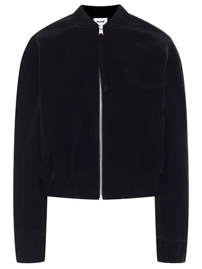-Черный бомбер из фактурного бархата от ALINE. -Модель полуприлегающего кроя с длинными рукавами, широкими манжетами и поясом на резинке, застежкой на молнию.