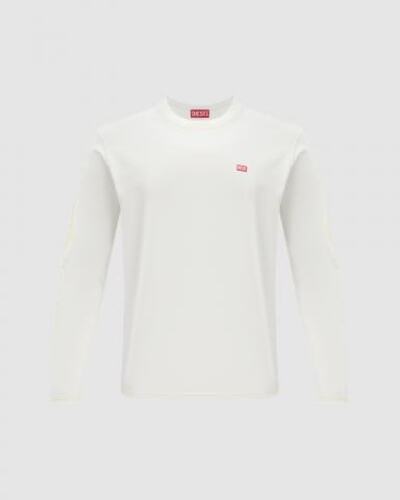 Футболка из хлопковой ткани Diesel. Белая футболка с длинными рукавами станет важной деталью при составлении базового гардероба. Модель выполнена из 100% хлопка, с небольшим акцентом в виде принта Diesel. Прямой крой позволит носить футболку вторым слоем под толстовки или джемперы. За счет универсального дизайна, вы сможете сочетать модель как со спортивными, так и с повседневными низами.