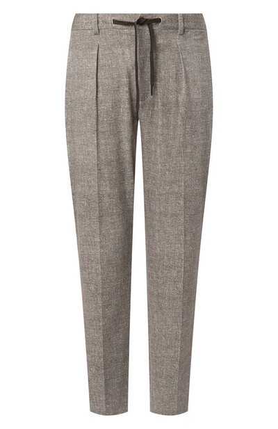 Брюки с защипами спереди сшили из меланжевой хлопковой ткани стрейч. Модель с боковыми карманами и прорезными задними на пуговицах дополнили поясом-кулиской, позволяющим обойтись без ремня.