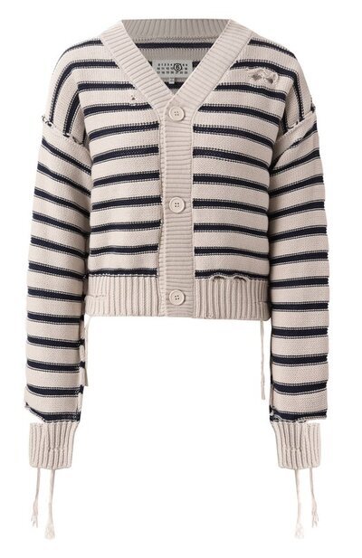 Укороченному кардигану с V-образным вырезом придали состаренный вид за счет декоративных разрывов, выступивших нитей и распоротых рукавов. Модель из хлопкового трикотажа с жаккардовым полосатым узором застегивается пуговицами. На спинке – фирменная белая строчка.