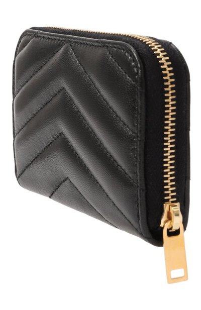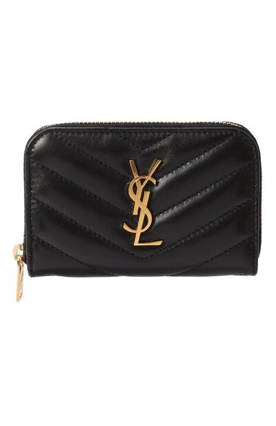 Стеганому портмоне Cassandre из мягкой наппы дала название одноименная монограмма YSL спереди. Модель с парой слотов и двумя отделениями, разделенными карманом, застегивается круговой молнией.
