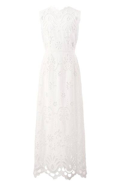 В коллекцию Capri вошло приталенное макси-платье из хлопкового поплина с ажурной цветочной вышивкой ришелье. Приталенная модель застегивается потайной молнией сзади.