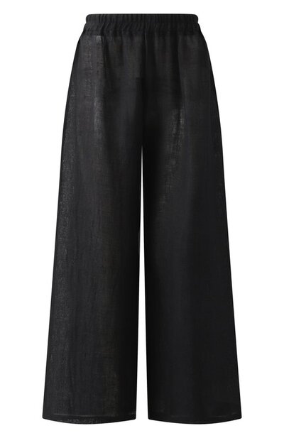 Широкие расклешенные брюки с эластичным поясом сшили из тонкого льна, усиленного полиамидом. Полупрозрачную модель наши стилисты предлагают носить с парным топом и сандалиями.
