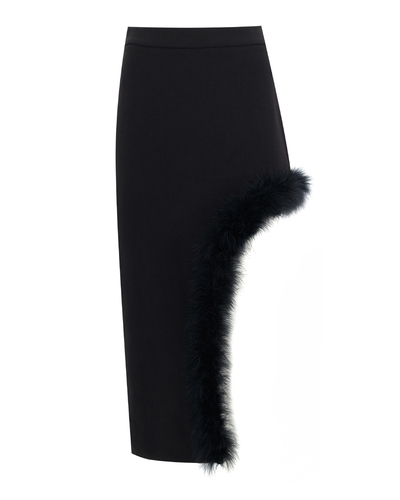 Юбка Amen — это смелое сочетание классической элегантности и современного шика. Глубокий черный цвет подчеркивает утонченность и придает образу выразительность. Асимметричный крой с эффектным разрезом добавляет интригу и динамику, привлекая внимание к линии ноги. Отделка перьями вдоль разреза становится главным акцентом, создавая ощущение роскоши и утонченного стиля. Чистые линии и лаконичный крой обеспечивают идеальную посадку и подчеркивают изящность силуэта. Эта юбка прекрасно подойдет для вечерних мероприятий, добавив нотку драматизма и харизмы в ваш образ.