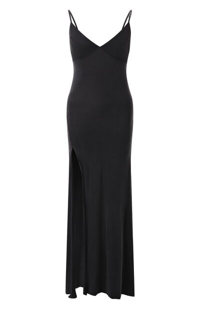 Платье с регулируемыми бретелями, одну из которых украсили фирменной пряжкой, сшили из купро. Облегающую модель с многослойными треугольными чашечками из полупрозрачного тюля дополнили высоким разрезом спереди.