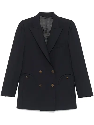 navy blue double-breasted button fastening shoulder pads two front button-fastening jetted pockets American rear vent