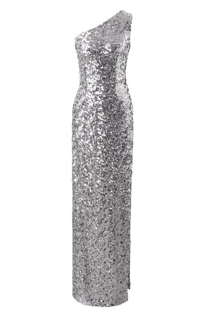 Платье с широкой бретелью на одно плечо и высоким разрезом слева выполнили из нейлонового тюля стрейч, полностью расшитого пайетками. В комплект включили короткие шорты с эластичными краями.