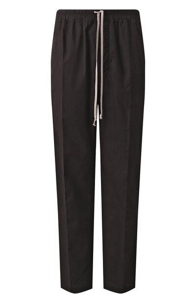Брюки с боковыми карманами и накладными задними с клапанами сшили из тонкой ткани. Модель со стрелками дополнили регулируемым поясом-кулиской со знаковым для марки длинным шнуром.