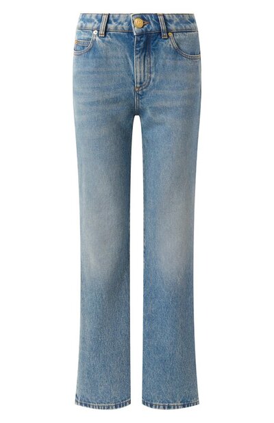 Расклешенные пятикарманные джинсы из хлопкового денима с эффектом делаве украсили на поясе сзади патчем с логотипом марки. Застежку дополнили пуговицей Double Chain Lion.