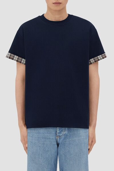 Тёмно-синяя футболка BOTTEGA VENETA с круглым вырезом горловины на резинке. Для изготовления модели расслабленного силуэта выбран мягкий хлопковый трикотаж. Отличительной особенностью изделия являются вставки с разноцветным геометрическим мотивом в клетку снизу на рукавах, создающие двухслойный эффект наложения. Принадлежность футболки Дому деликатно обозначена вышитым белым логотипом на вставке слева (на внутренней стороне рукава).
