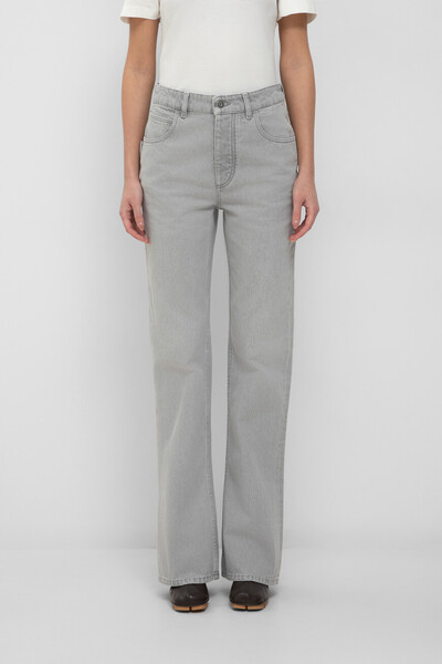 Джинсы-клёш светло-серого цвета от BOTTEGA VENETA. Для изготовления повседневной модели используется мягкий хлопковый деним с выбеленным эффектом. На поясе сзади присутствует прямоугольная зелёная накладка, а задние карманы украшает тройная дизайнерская строчка-вышивка в виде литеры «V». Носите изделие с кардиганом с широким воротником в два сложения из той же коллекции.