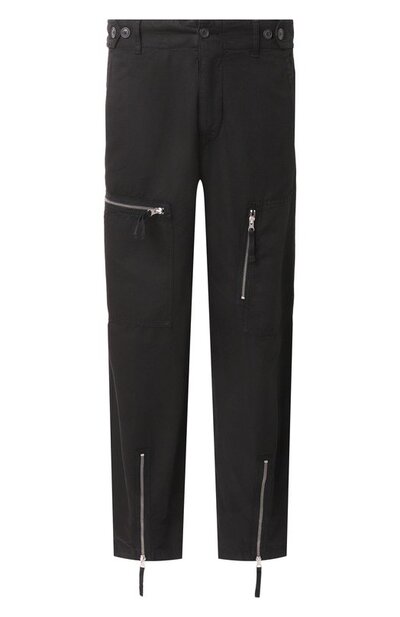 Нижние молнии на черных брюках скрывают вставки в тон и гармонируют с асимметричными застежками на накладных карманах. Пояс со шлевками дополнен резинкой сзади и регулируемыми патами. Модель с двумя боковыми карманами и одним задним сшита из твила на основе хлопка и льна.