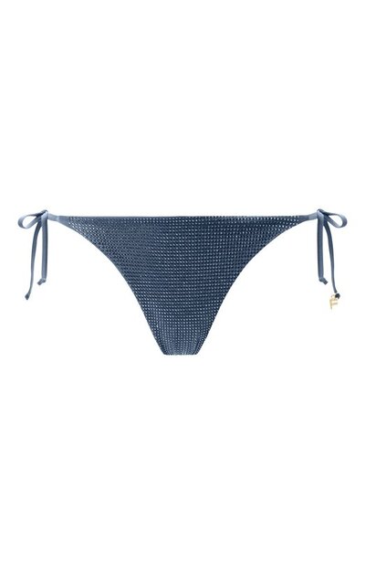Плавки сшили из стрейчевой микрофибры, полностью покрытой стразами. Посадка модели с фирменной эмблемой на пару тонов светлее регулируется завязками по бокам.