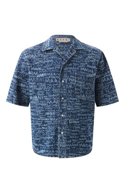 Джинсовую рубашку с фигурными кокетками и английским воротником дополнили нагрудным карманом с клиновидным стичингом. Модель с потертостями сшили из денима с брендированным паттерном.