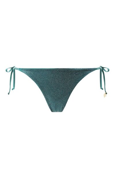Плавки-бикини сшили из стрейчевой быстросохнущей микрофибры со стразами в тон по всей поверхности. Посадка модели регулируется узкими шнурами, завязывающимися по бокам.