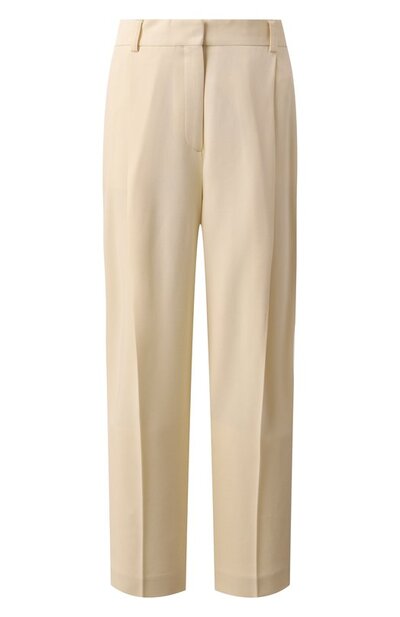 Брюки с защипами и двумя парами карманов выполнили из вискозы с добавлением шерсти первого пострига. Модель оттенка Butter предлагаем рифмовать с парным топом.