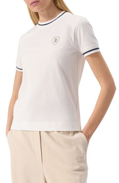 Футболку с контрастным кантом на рифленых манжетах и горловине сшили из хлопкового интерлока. Спереди модель украсили геральдической эмблемой Solomeo, вышитой разноцветными нитями.