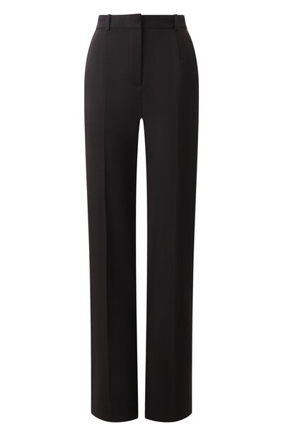 Брюки с подкладкой из купро сшили из шерсти первого пострига с добавлением эластана. Модель с брендированной нашивкой сзади и четырьмя карманами застегивается потайными молнией и крючком.