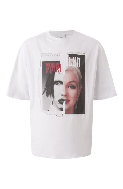 Футболка прямого кроя выполнена из гладкого хлопкового джерси. Модель с круглой горловиной украшена спереди коллажным принтом из портретов Мерилина Мэнсона и Мерлин Монро, а сзади — информационным патчем.