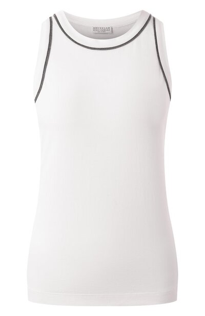 Круглую горловину и проймы хлопковой майки украсили контрастной отделкой из цепочки мониль. Модель органично впишется в повседневный образ разной степени сложности и цветовой гаммы.