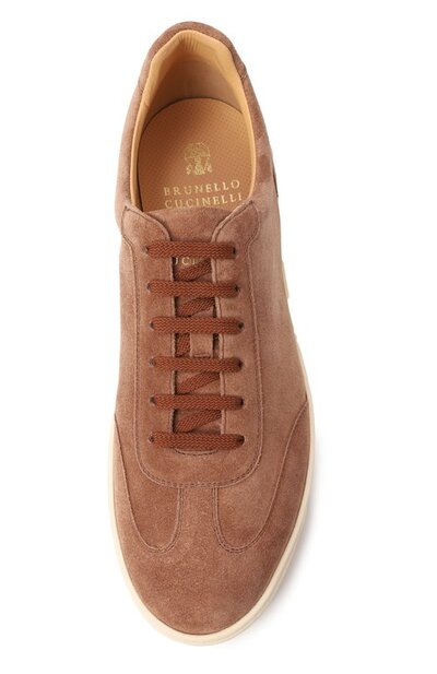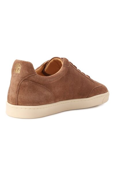 Кеды на резиновой подошве украшены золотистой фирменной эмблемой на заднике и логотипом на язычке. Пару из стираной замши вручную отшлифовали, чтобы создать слегка неровную фактуру и тональные переходы. Внутреннюю отделку и перфорированную стельку выполнили из гладкой кожи.