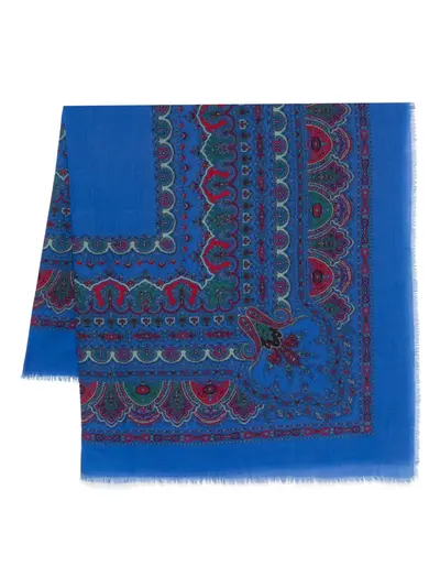 circa 1970s cobalt blue wool square shape paisley print solid border frayed edge Condition: GOOD. This previously owned and used item is in good condition with minimal signs of use. This may include fading of material or plating and scratches.