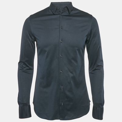 This Emporio Armani long sleeve shirt in navy blue cotton jersey combines comfort with understated sophistication, making it a versatile addition to any wardrobe.