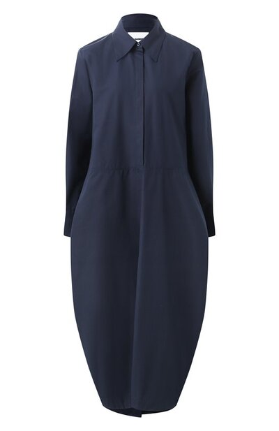 Платье-рубашку с прямоугольными манжетами, бантовой складкой сзади и подолом-колоколом дополнили боковыми карманами. Модель из органического хлопка застегивается потайными пуговицами.