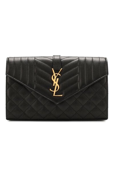 Черный цвет задает тон сумке Envelope, а выразительно она выглядит за счет деталей. Модель из мелкозернистой кожи с ненавязчивым блеском украсили стеганым узором, в котором замиксовали сразу три орнамента. А акцентом в геометрической композиции сделали позолоченную монограмму Кассандра, составленную из инициалов Ива Сен-Лорана. Небольшое изделие дополнили съемным ремнем-цепочкой.