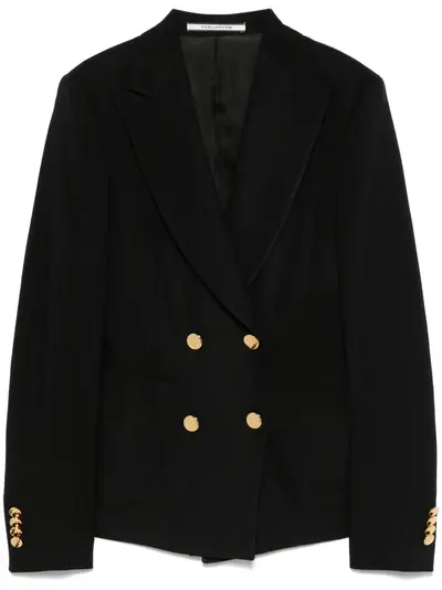 black double-breasted button fastening shoulder pads two front patch pockets American rear vent